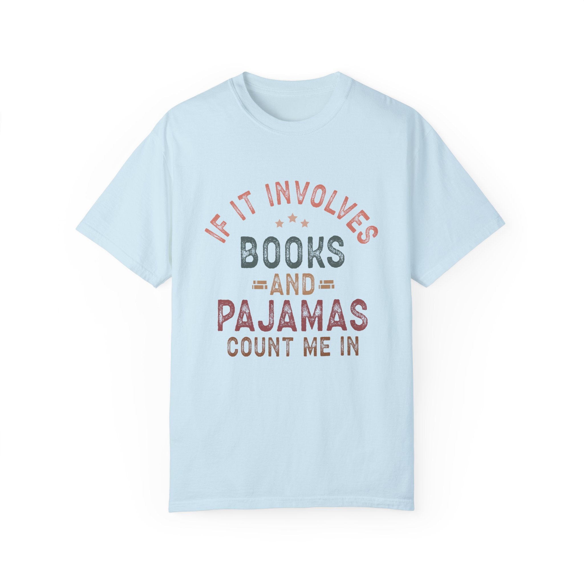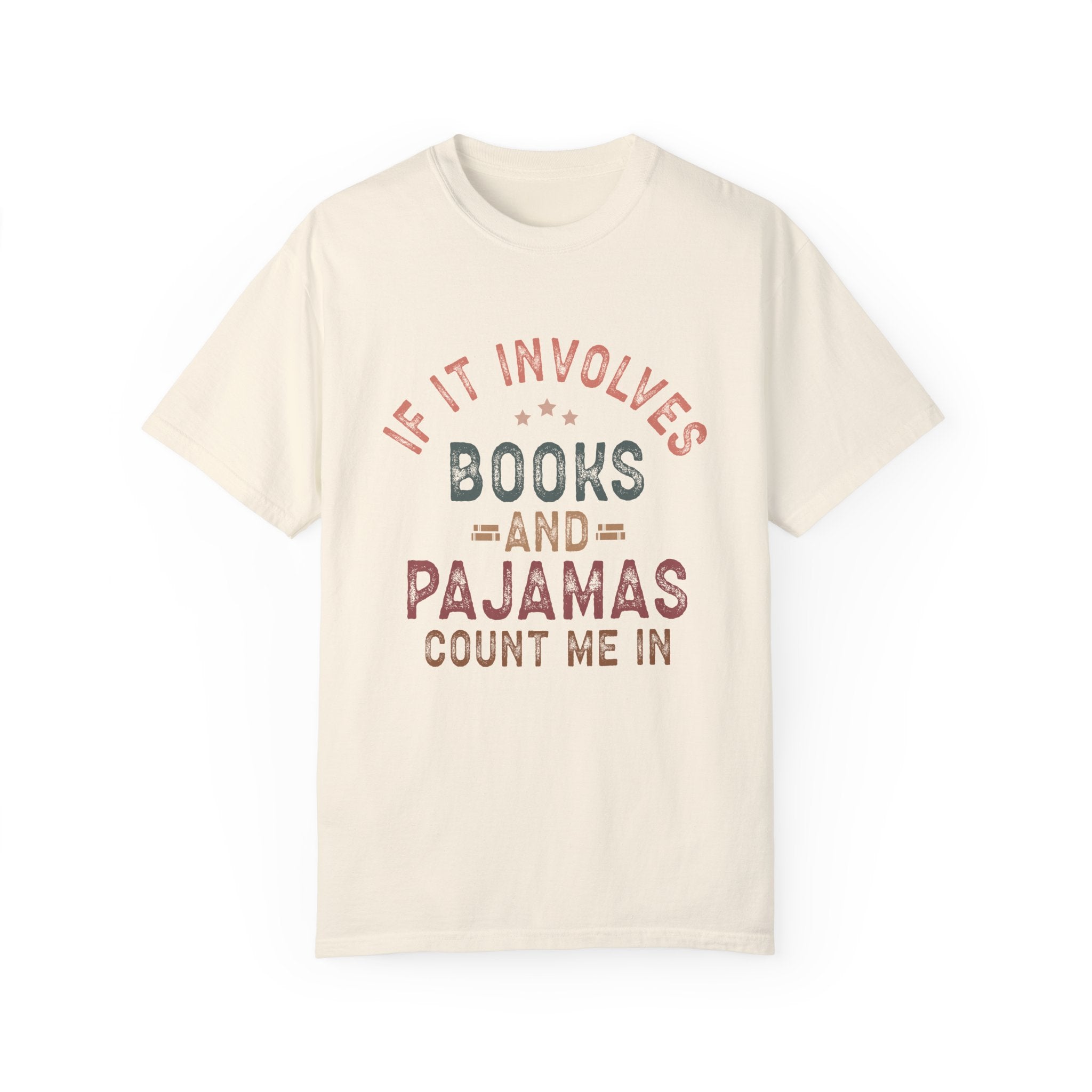 Funny T-shirt with the quote "If it involves books and pajamas count me in"; giving off a cozy and laid-back vibe. Perfect for book lovers and those who enjoy lounging in comfort. Relevant for book reading days, pajama parties, and casual hangouts.