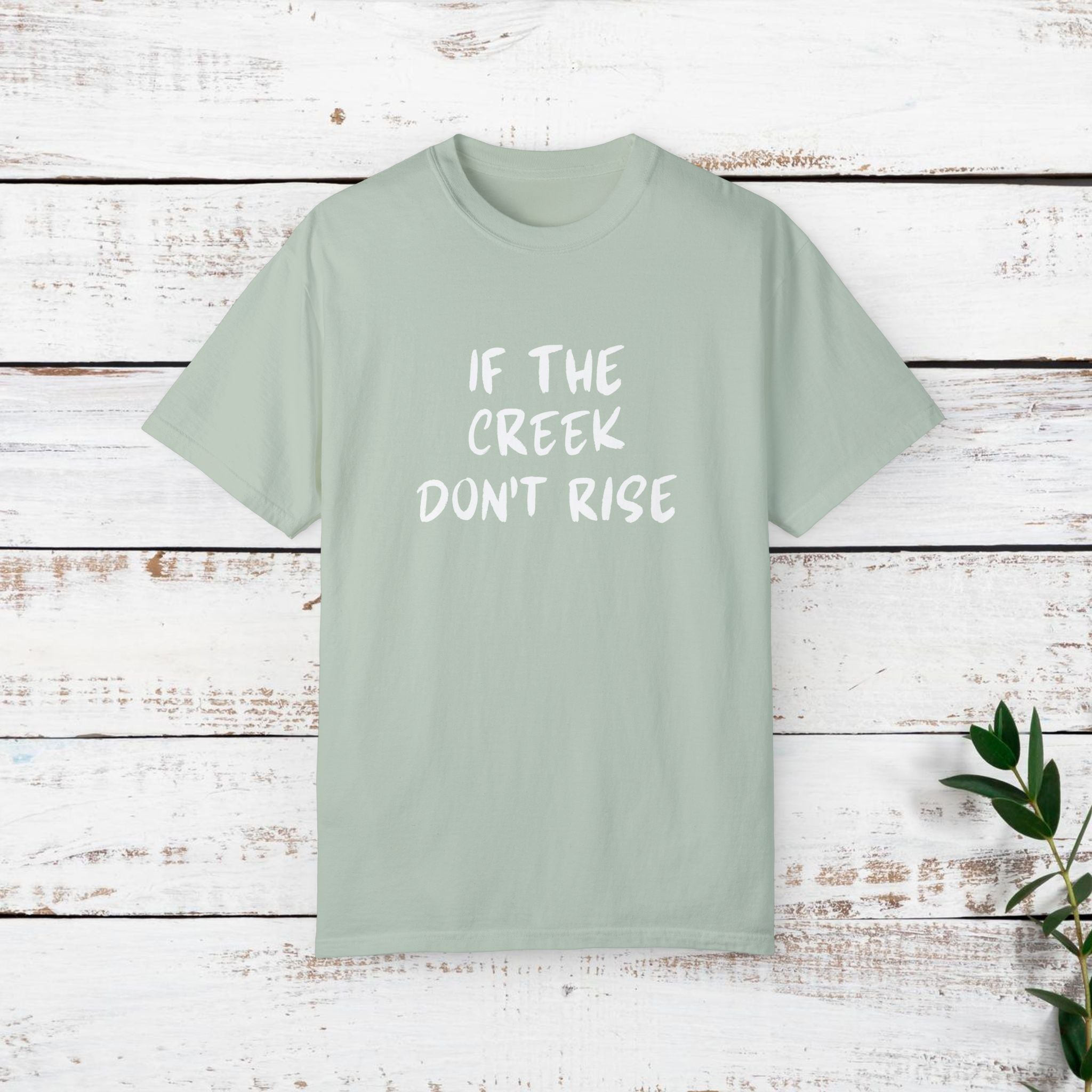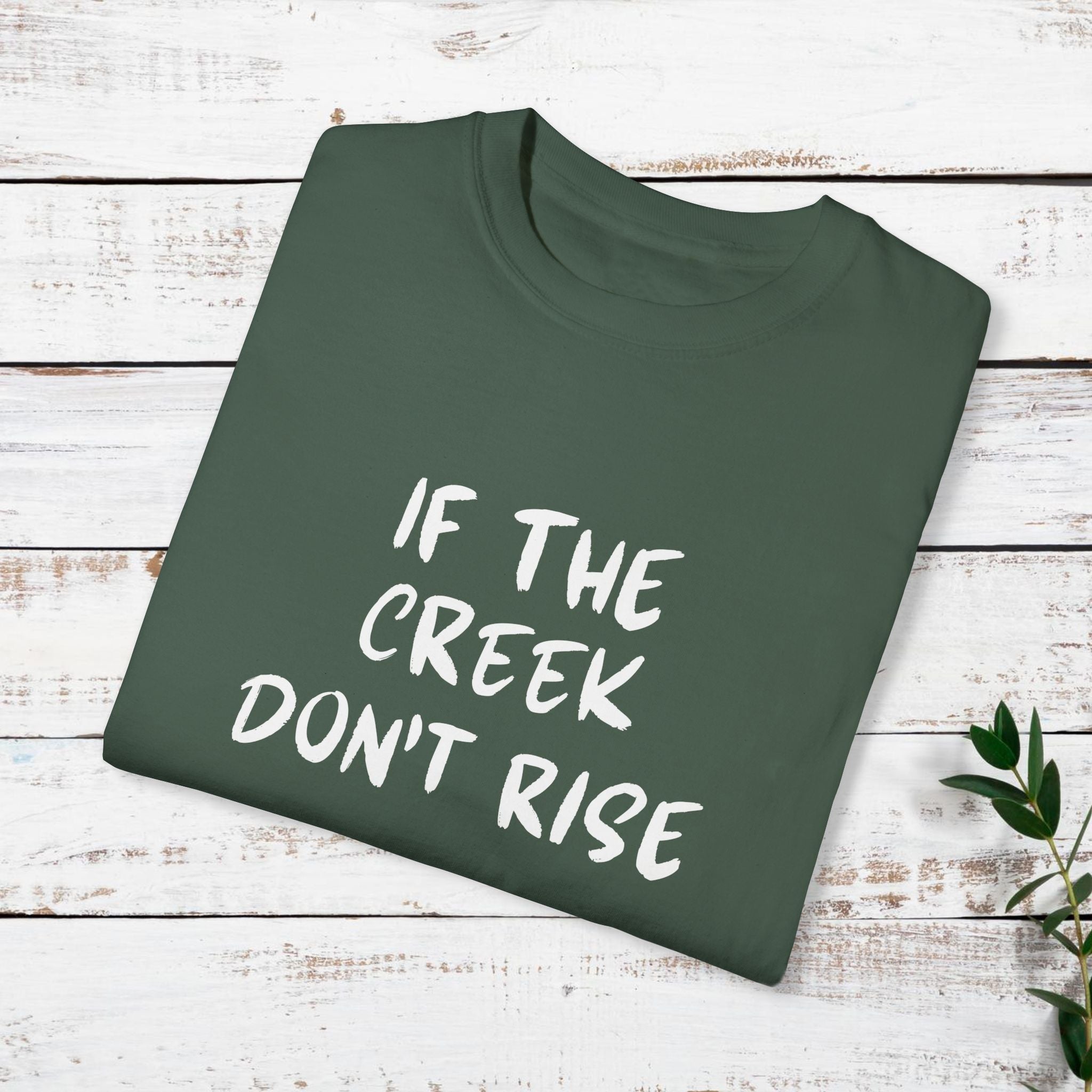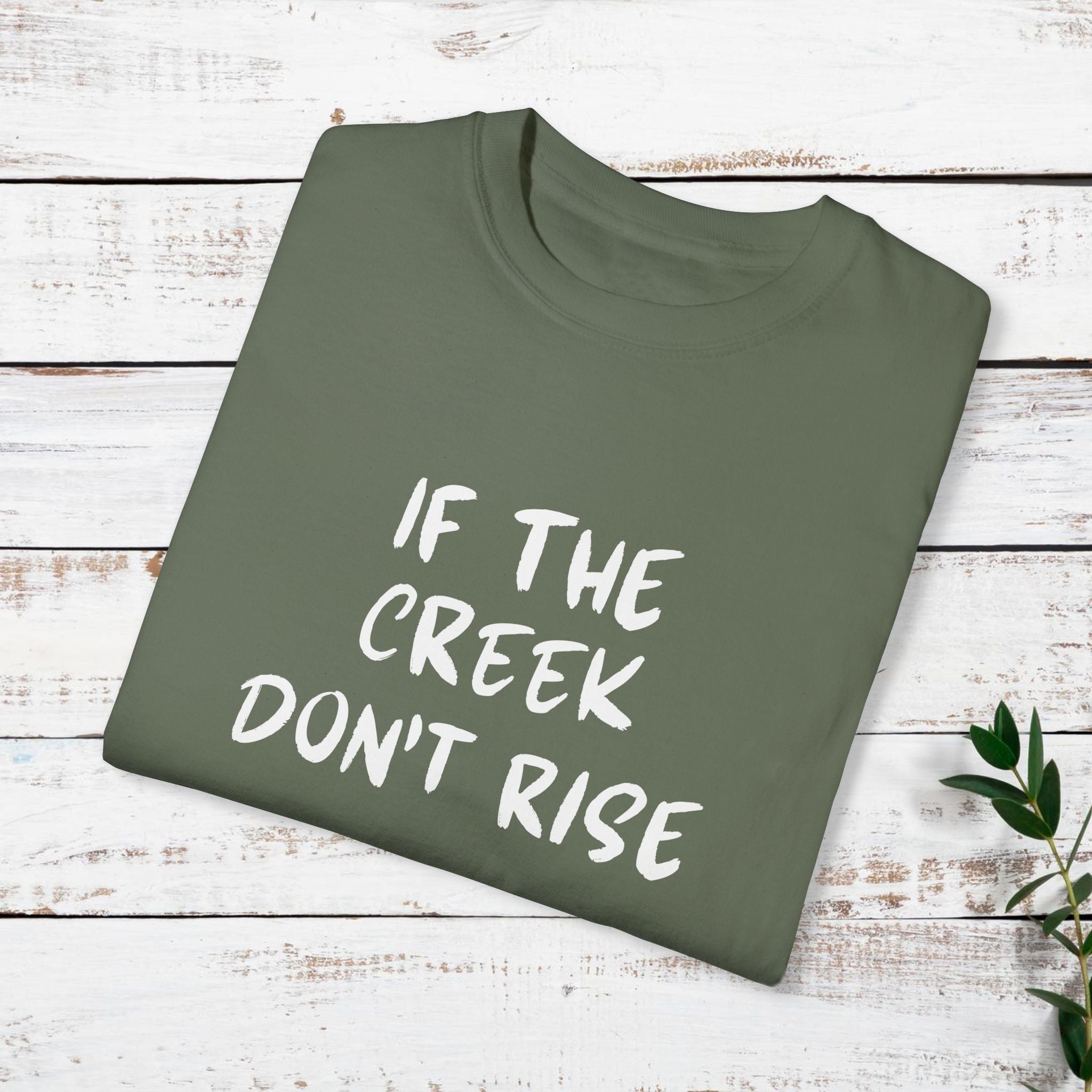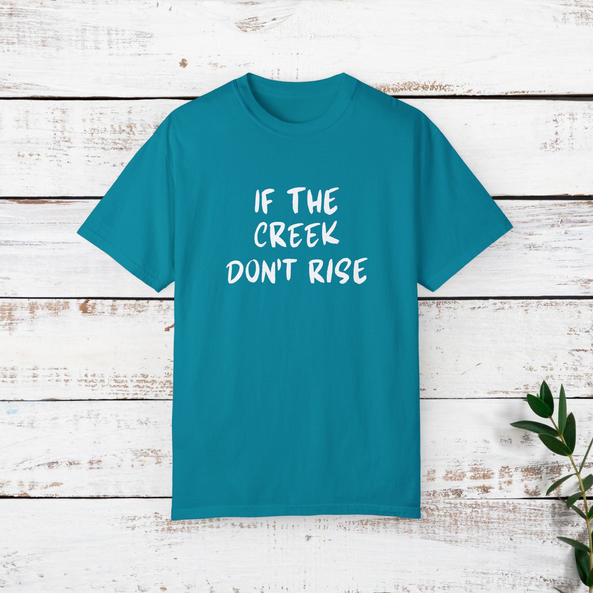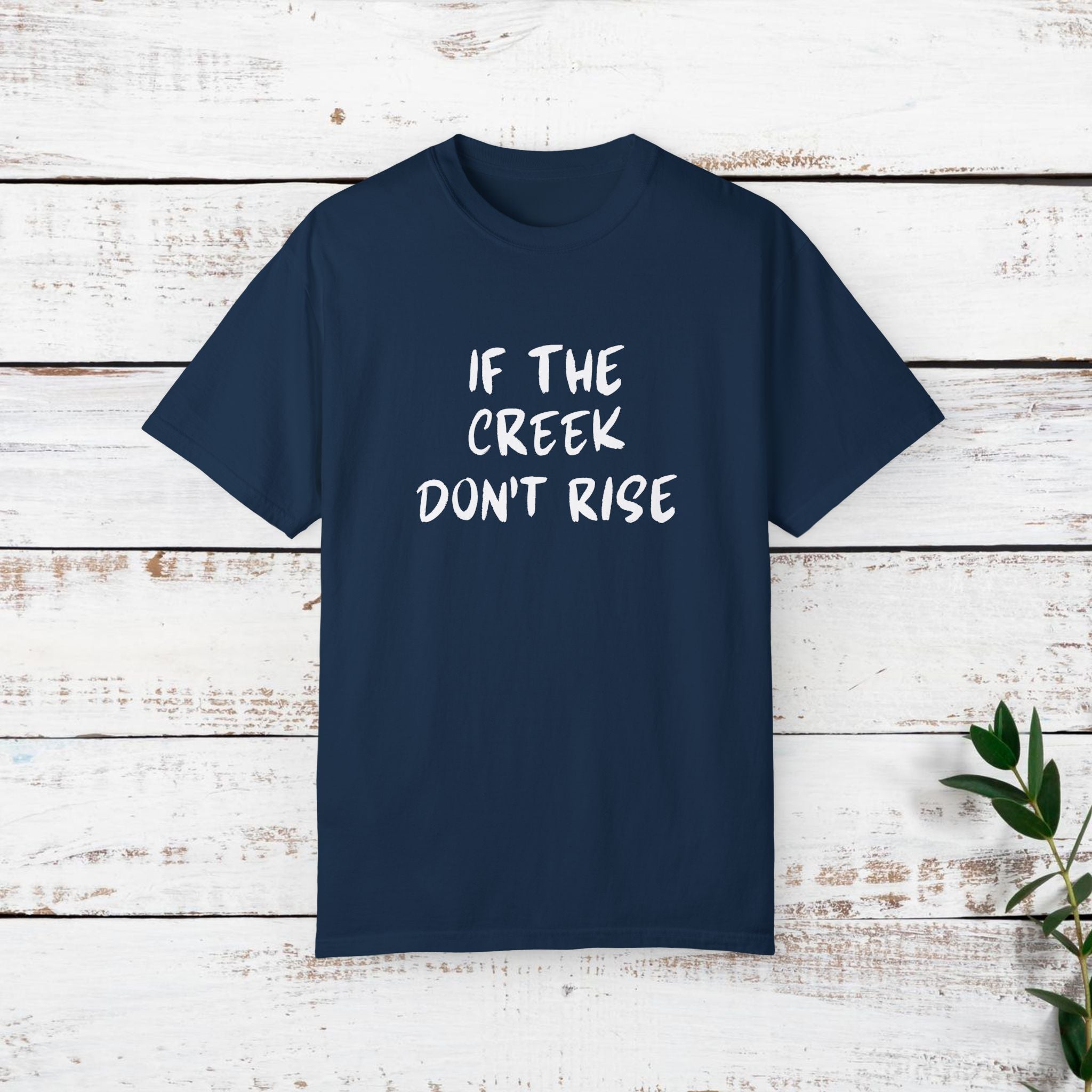 Funny T-shirt with the quote "If the creek don't rise". This t-shirt gives off a casual and humorous vibe, perfect for everyday wear or as a conversation starter. It is ideal for adults looking for a comfortable and stylish garment to wear during casual outings, gatherings, or events. Relevant for holidays, birthdays, or any occasion where a fun and relaxed attire is needed.